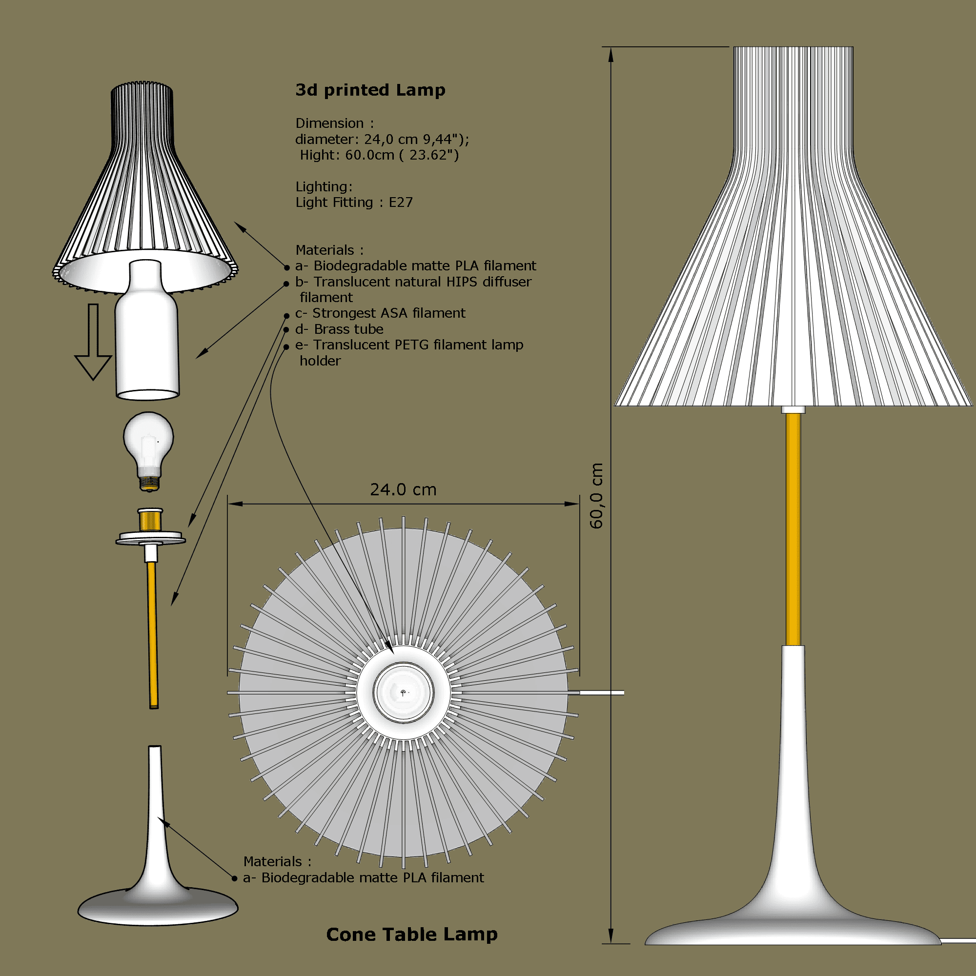 Made with eco-friendly PLA, translucent HIPS, and a durable brass tube structure, this lamp offers a balance of sustainability, durability, and design. The tall silhouette and classic shape make it an ideal piece for both contemporary and traditional interiors.